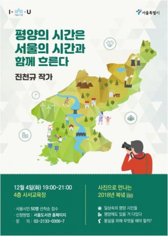 이번 강연은 판문점 출입기자로 활동하고, 2017년 10월 국내에서 유일하게 방북 취재를 성공한 진천규 작가와의 만남으로 방북 취재내용을 토대로 출간한 도서 <평양의 시간은 서울의 시간과 함께 흐른다(타커스/2018)>에 담긴 내용을 시민들과 함께 나누고자 한다.