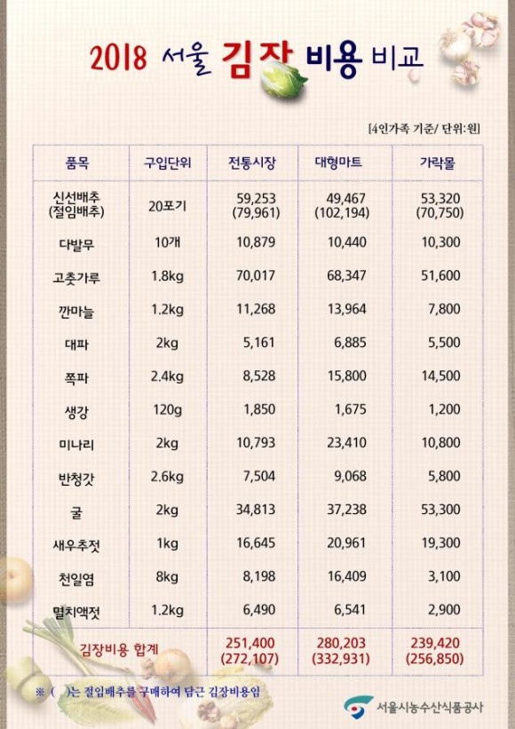 |  | | | ⓒ (주)영남도민일보 | | [영남도민일보] 이남희 기자 = 서울시농수산식품공사(사장 김경호, 이하 '공사')는 김장 성수기를 앞두고 서울 시민에게 유익한 정보를 제공하고, 친지·이웃과 정을 나누는 김장 문화 확산을 위해 서울시 25개 자치구 내 전통시장, 대형마트 및 가락시장 내 가락몰 등 총 61곳을 대상으로 4인 가족(배추 20포기 기준) 김장 비용을 조사‧발표했다.