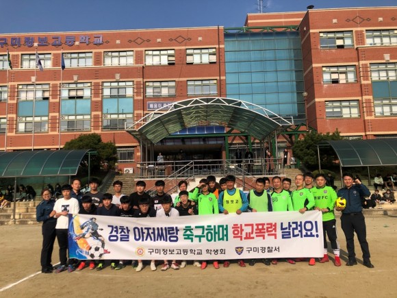 |  | | | ⓒ (주)영남도민일보 | | [영남도민일보] 김옥순 기자 = 구미경찰서는 지난 19일 14시 구미시 정보고등학교 운동장에서 구미경찰서 경찰관들과 학교 학생들이 함께하는 청소년 비행예방 및 학교폭력 근절 축구 대회를 개최하였다.