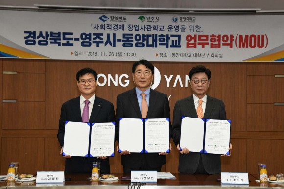 |  | | | ⓒ (주)영남도민일보 | | [영남도민일보] 김창기 기자 = 경상북도, 영주시, 동양대는 글로벌 사회적경제 창업가를 육성하고 창업을 활성하기 위해 업무협약을 체결했다.