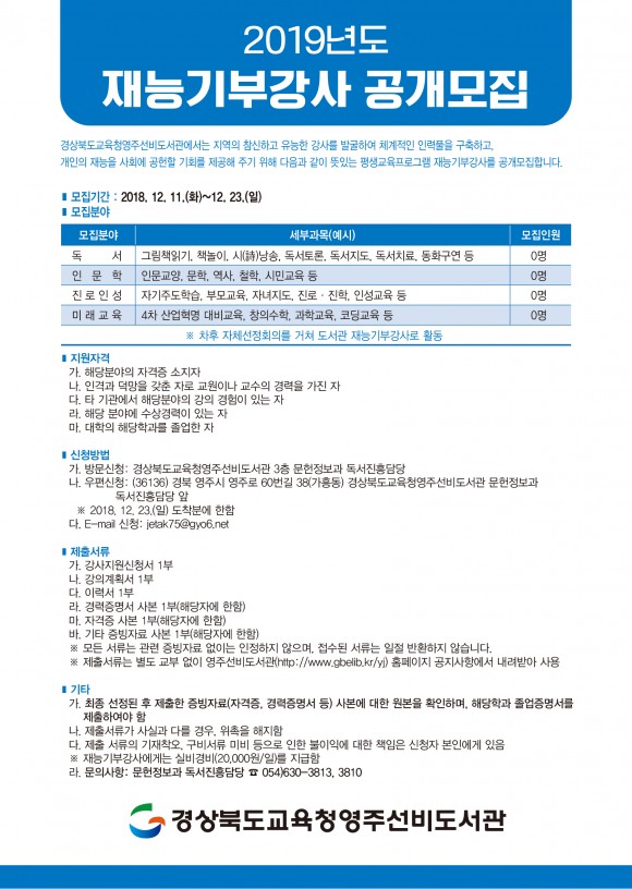 「2019년도 재능기부강사」공개 모집기간은 2018년 12월 11일(화)부터 12월 23일(일)까지이며, 제출서류는 별도 교부 없이 영주선비도서관 홈페이지(http://www.gbelib.kr/yj) 공지사항에서 양식을 내려받아 사용하면 된다. 기타 자세한 내용은 홈페이지 및 3층 문헌정보과(☏054-630-3813)로 문의하면 된다