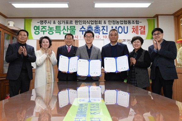 |  | | | ⓒ (주)영남도민일보 | | [영남도민일보] 김창기 기자 = 영주시(시장 장욱현)는 10일 시청 직소민원실에서 싱가포르 한인외식협회(회장 남경수), 안정농업협동조합(조합장 황갑식)과 영주콩(부석태)을 비롯한 영주농축특산물 싱가포르 수출 확대를 위한 업무협약을 체결했다.