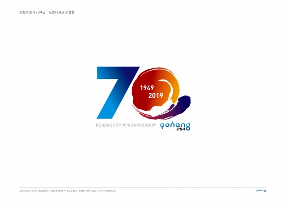 이번 기념 엠블럼은 시승격 70년의 의미를 되새기고 새로운 도약 100년을 준비하기 위해 70년 숫자를 강조했으며 ‘0’을 환동해 중심으로 도약하는 태양으로 표현해 북방경제를 펼쳐 나아가는 형상으로 ‘제1의 환동해 물류도시 포항’, ‘희망찬 환동해 중심도시 포항’의 비전을 담고 있다.