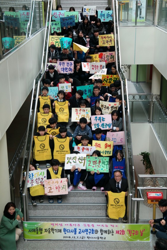 한다사중학교는 친구에게 고마움과 사랑의 마음을 전하고 서로 잊지 못할 추억을 쌓으면서 친구와의 관계를 통해 청소년기부터 건강한 인간관계를 형성할 수 있도록 하기 위해 ‘친구야! 함께여서 고마워!’라는 슬로건으로 2회째 친구의 날 행사를 실시하고 있다.