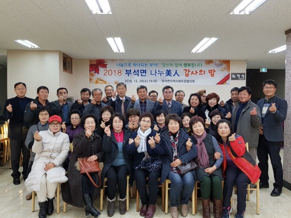 |  | | | ⓒ (주)영남도민일보 | | [영남도민일보] 김창기 기자 = 부석면 지역사회보장협의체(공동위원장 장세호)가 주관하는 『2018 부석면 나누美人 감사의 밤』 행사가 26일(수) 오후 4시 부석사 식당에서 개최됐다.