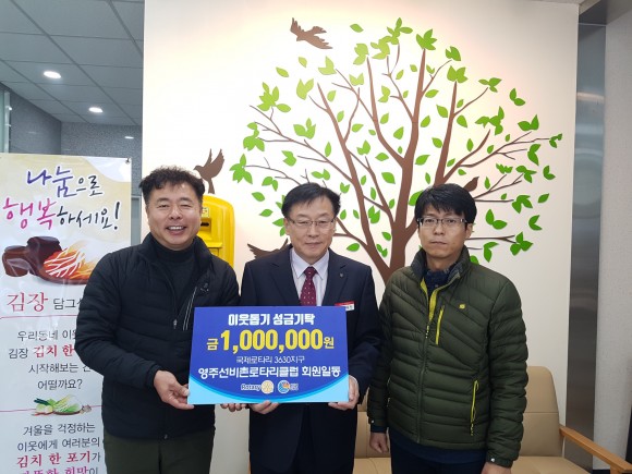 |  | | | ⓒ (주)영남도민일보 | | [영남도민일보] 김창기 기자 = 영주시 선비촌로타리클럽은 26일에 가흥1동 행정복지센터를 방문해 지역 내 어려운 이웃을 도와주길 바란다며 성금 100만원을 기탁했다.