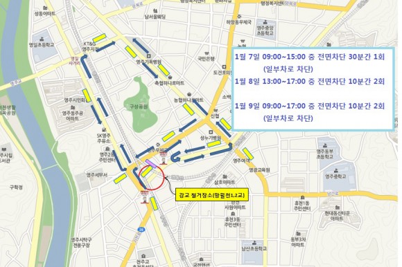 영주세무서사거리에서 구성오거리 방향 영주1,2교는 8일 오전 9시부터 낮 12시까지 10분간 2회 정도 전면차단 된다. 청담동갤러리에서 그랜드컨벤션웨딩 구간은 오는 7일부터 9일까지 부분적으로 일부차로 통행이 차단된다.