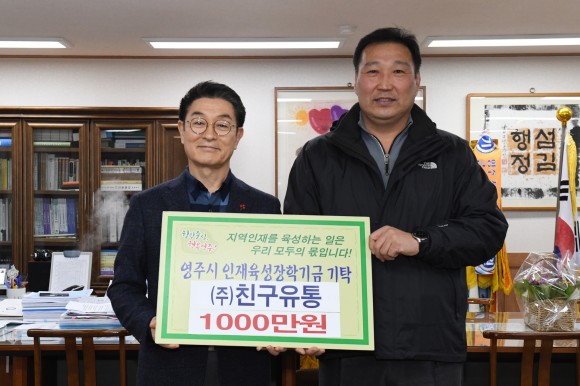 |  | | | ⓒ (주)영남도민일보 | | [영남도민일보] 김창기 기자 = 영주시는 친구유통(주)(대표 하원태)과 개인 기탁자 송인규씨가 영주시인재육성장학회를 방문해 장학금 1000만원과 100만원을 각각 기탁했다고 14일 밝혔다.