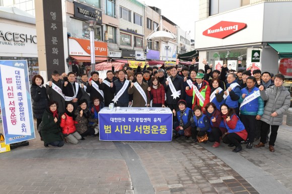 이날 영주 문화의 거리 범시민 서명운동에서 장욱현 영주시장을 비롯한 이중호 영주시의회의장ㆍ시의원, 영주시체육회, 시민 등 100여명이 참석해 서명운동에 동참하며 대한민국 축구종합센터 유치에 강력한 의지를 밝혔다.