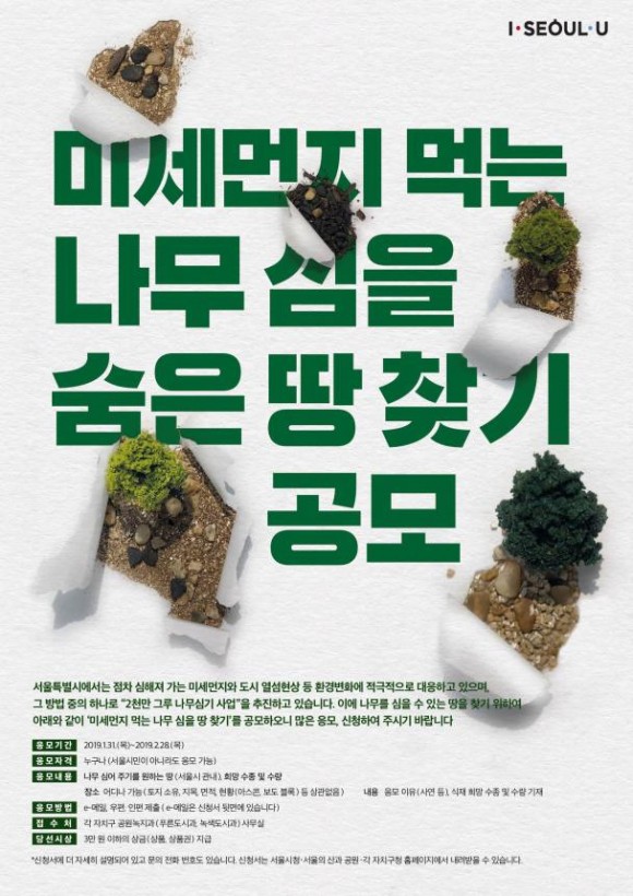 |  | | | ⓒ (주)영남도민일보 | | [영남도민일보] 이남희 기자 = 서울시는 점점 심해져가는 미세먼지와 도시 열섬현상 등에 보다 적극적으로 대응하고자, 시민들이 나무 심을 땅을 찾아내면 그 장소에 원하는 나무를 심어주는 <미세먼지 먹는 나무 심을 땅 찾기 공모>를 대대적으로 시행한다고 밝혔다.