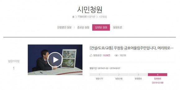 답변자로 나선 이상달 도시안전국장은 “답변을 영상으로 하는 방식이라 조금 낯설지만, 답변 내용이 시민들에게 정확하게 전달되었으면 좋겠다.”며 소감을 밝히고, 청원 요지별로 현황판을 활용하여 시민들이 이해하기 쉽도록 답변을 했다.
