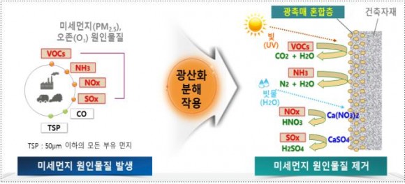 적용되는 광촉매 도료는, 서울시 산하 SH공사(도시연구원)에서 작년 선진국형 미세먼지 저감기술인 광촉매 기술 국산화 연구를 통해 실용화 하였으며, 건축물 외벽에 시공될 경우 주변 공기 중 미세먼지를 흡착하여 광분해하며 잔여물은 빗물에 씻겨 내려가 미세먼지가 제거되는 원리이다. SH공사는 작년 아파트 일부에 적용하여 미세먼지 저감 효과를 현재 모니터링 중에 있다.