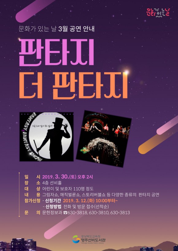 |  | | | ⓒ (주)영남도민일보 | | [영남도민일보] 김창기 기자 = 경상북도교육청영주선비도서관(관장 김순연)은 3월 30일 오후 2시 에 문화가 있는 날을 맞이하여 판타지 공연을 개최한다.