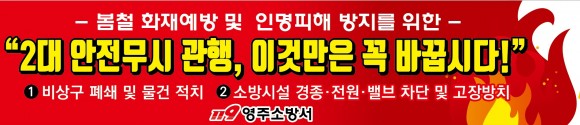 |  | | | ⓒ (주)영남도민일보 | | [영남도민일보] 김창기 기자 = 영주소방서는 안전무시 관행으로 인한 인명 및 재산 피해 발생을 예방하고자 「2대 고질적 안전무시 관행 근절」을 위해 지켜야 할 사항을 알려 안전문화운동의 확산을 추진한다.