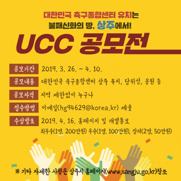 |  | | | ⓒ (주)영남도민일보 | | [영남도민일보] 최교열 기자 = 상주시(시장 황천모)는 3월 26일부터 4월 10일까지‘대한민국 축구종합센터는 불패신화 상주시로!”라는 주제로 UCC공모전을 개최한다.