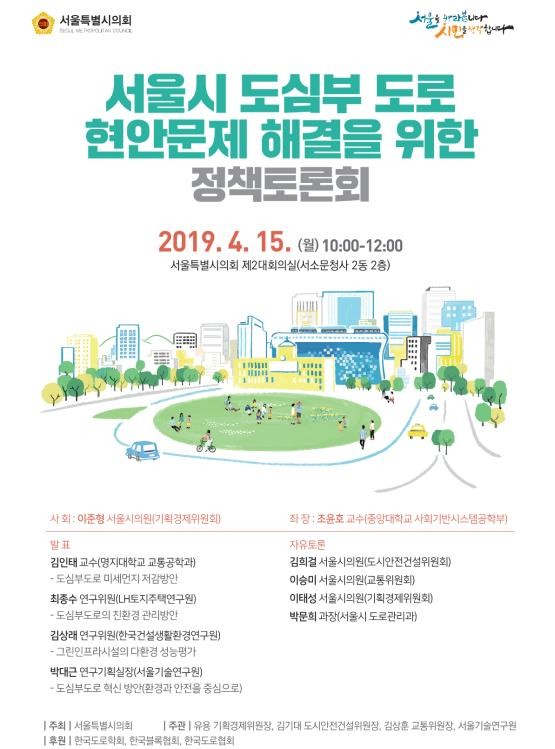 |  | | | ⓒ (주)영남도민일보 | | [영남도민일보] 이남희 기자 = 서울기술연구원과 서울특별시의회는 15일 ‘서울시 도심부 도로 현안문제 해결을 위한 정책토론회’를 개최한다.