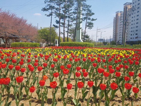 북천교․후천교 주변 및 법원 앞 둔치에 지난해 12월에 파종한 튤립 4만여 본이 한창 꽃망울을 터트리며 봄을 알리고 있다.