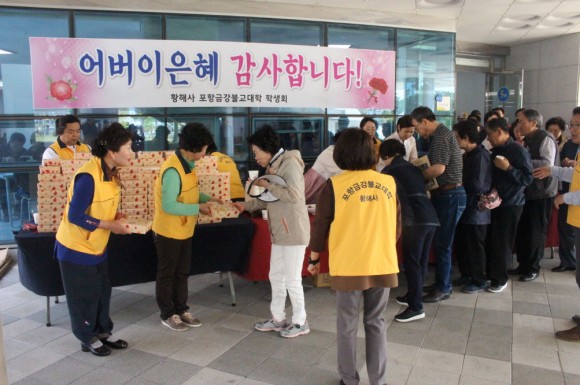 이날 행사는 대한불교천태종 황해사 포항금강불교대학 총학생회(회장 김낙상) 주관으로 열렸으며, 황해사 다도회의 도움으로 평생학습원을 찾은 500여명의 어르신들과 시민들에게 감사의 편지와 차, 사탕, 떡 등을 전달했다.