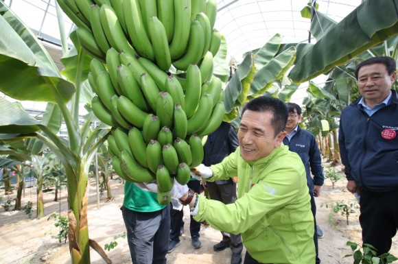 기후변화에 선제적 대응하기 위해 포항시가 대체작목으로 도입한 ‘바나나’가 흥해 망천리 소재 비닐하우스 재배에 성공함에 따라 9일 바나나 체험농장 개장식을 갖고 농업의 새로운 가능성을 열었다.