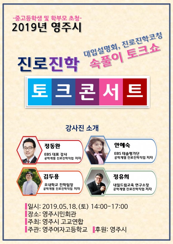 |  | | | ⓒ (주)영남도민일보 | | [영남도민일보] 김창기 기자 = 영주시는 오는 18일 오후 2시 영주시민회관에서 ‘2019년 진로 진학 토크콘서트’를 개최한다.