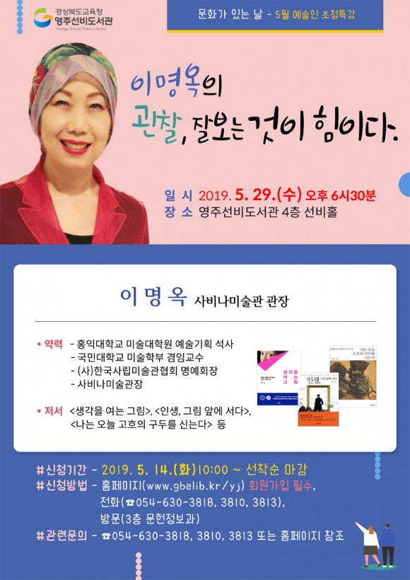 |  | | | ⓒ (주)영남도민일보 | | [영남도민일보] 김창기 기자 = 경상북도교육청영주선비도서관(관장 김순연)은 오는 5월 29일(수) 에 사비나미술관장 이명옥을 초청해‘이명옥의 관찰, 잘 보는 것이 힘이다’를 주제로 특강을 개최한다.