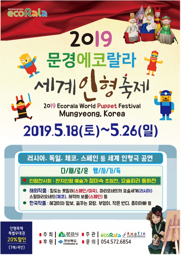 올해 처음 개최되는 ‘2019 문경에코랄라 세계인형축제’는 한국의 전통인형 뿐 아니라, 러시아, 독일, 체코, 스페인 등 세계 6개국의 다채로운 인형극을 만나볼 수 있는 축제로 ‘혜경이와 맘보’, ‘꿈꾸는 유랑’, ‘부엉이’ 등 국내 작품을 비롯해 ‘힐도는 못말려(스페인/미국)’, ‘마리오네뜨의 요술세계(러시아)’, ‘스윙마리오네뜨(체코)’, ‘해적의 보물(스페인)’등의 해외작품도 함께 즐길 수 있다.