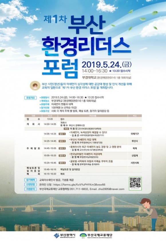 |  | | | ⓒ (주)영남도민일보 | | [영남도민일보] 영남도민일보 기자= 부산시(시장 오거돈)와 부산국제교류재단은 5월 24일 오후 2시, 부경대학교 환경해양관 1층 대회의실에서 청년들의 미세먼지 심각성에 대한 공감대 형성 및 인식 개선을 위해 ‘제1차 부산 환경리더스 포럼’을 개최한다고 밝혔다.