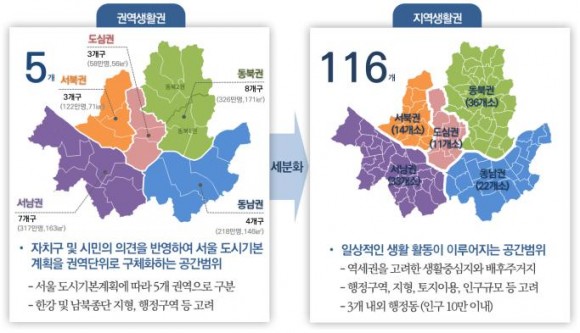 구체적으로 서울 전역을 5개 ‘권역’ 생활권으로 나누고, 각 권역을 116개 ‘지역’ 생활권(3~8개 행정동 단위)으로 세분화해 각각의 목표와 실천전략(총 493개 목표, 1,126개 실천전략)을 수립하였다.