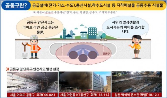 공동구는 전력, 통신, 가스, 상하수도 등 각종 생활기반시설을 한 곳에 모아 관리하는 시설이다. 지하에 매설돼 있다.