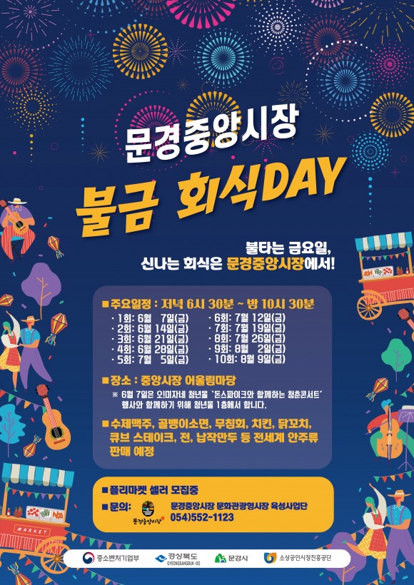'문경중앙시장 불금 회식 Day' 행사는 문경중앙시장 상인회와 문화관광형시장 육성사업단이 공동으로 기획하여 준비하는 행사로 지역주민들이 자유롭게 참여하고 청년몰의 청년상인들과 선배상인들이 함께 어우러지는 주민주도형 문화장터로 문경시 원도심의 침체된 상권에 활력을 불어넣을 수 있는 새로운 시도로 기대된다.