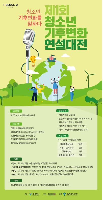 이상훈 환경정책과장은 “기후변화 연설대전은 미래 세대인 청소년들이 직접 기후변화에 대한 생각을 표현하고, 우리 사회와 시민들에게 기후변화에 대한 관심을 촉구할 수 있는 의미 있는 장이 될 것”이라며, “기후변화 문제 해결에 대한 청소년들의 참신하고 다양한 아이디어 제안을 기대한다. 관심 있는 청소년들의 많은 참여를 바란다.”라고 말했다.