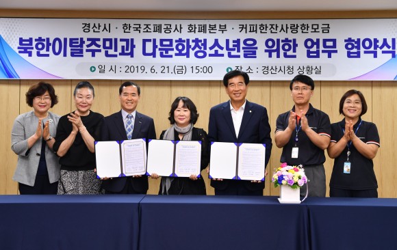 이번 협약은 경산시와 한국조폐공사 화폐본부와 커피한잔사랑한모금이 북한이탈주민과 다문화가정 청소년들에게 다양한 문화, 체육활동 및 생활 지원을 통하여 이들이 지역 내 안정적으로 정착할 수 있도록 돕기 위함이다.