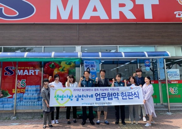|  | | | ⓒ (주)영남도민일보 | | [영남도민일보] 홍인환 기자 = 포항시 남구보건소는 21일 번개탄 판매개선사업의 일환으로 관내 10개 업소를 ‘생명사랑 실천가게’로 선정해 현판 부착 및 업무 협약을 체결했다.