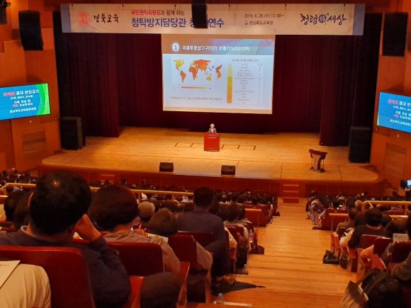 |  | | | ⓒ (주)영남도민일보 | | [영남도민일보] 김택선 기자 = 경북교육청(교육감 임종식)은 26일 포항 경상북도교육청문화원에서 본청, 직속기관, 교육지원청, 각급 학교 청탁방지담당관 등 970여 명을 대상으로 청렴 연수를 실시했다.