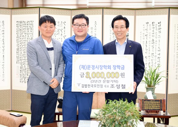 김밥천국 모전점은 지역인재양성을 위해 3년간 매년 100만원을 (재)문경시장학회에 후원하기로 했다. 조성철 대표는 “평소 미래의 꿈나무들을 위해 작은 도움이 되고 싶었는데, 지금이나마 실천할 수 있어서 정말 기쁘다.