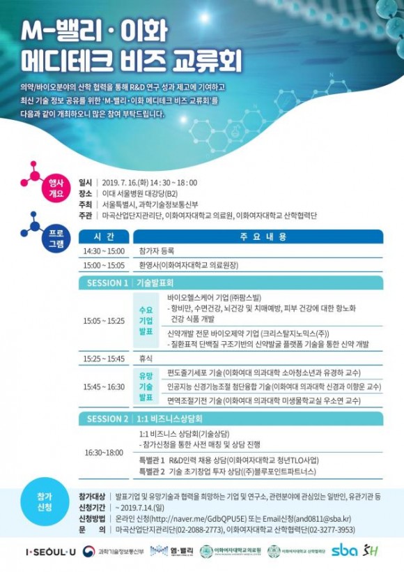 참가 대상은 의약·바이오 관련 마곡산업단지 입주기업 및 서울소재 중소기업, 이대 메디테크 연구진, 일반인 누구나 참여 가능하다.