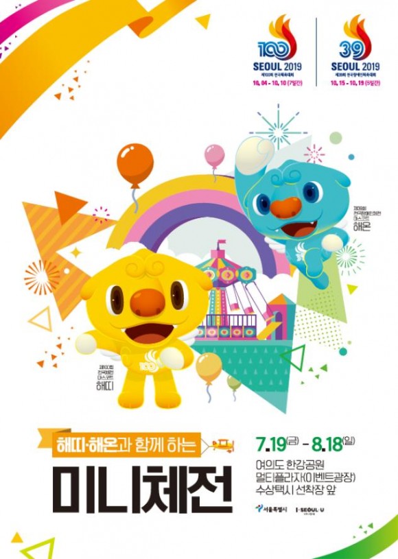 서울시는 7월 19일(금)~8월 18일(일)까지 한 달간 여의도 한강공원에서 2019 한강몽땅 여름축제와 연계하여 온가족이 함께 즐길 수 있는 ‘본격 전국체전 붐업 프로그램 : 해띠․해온과 함께 하는 미니체전’을 운영한다.