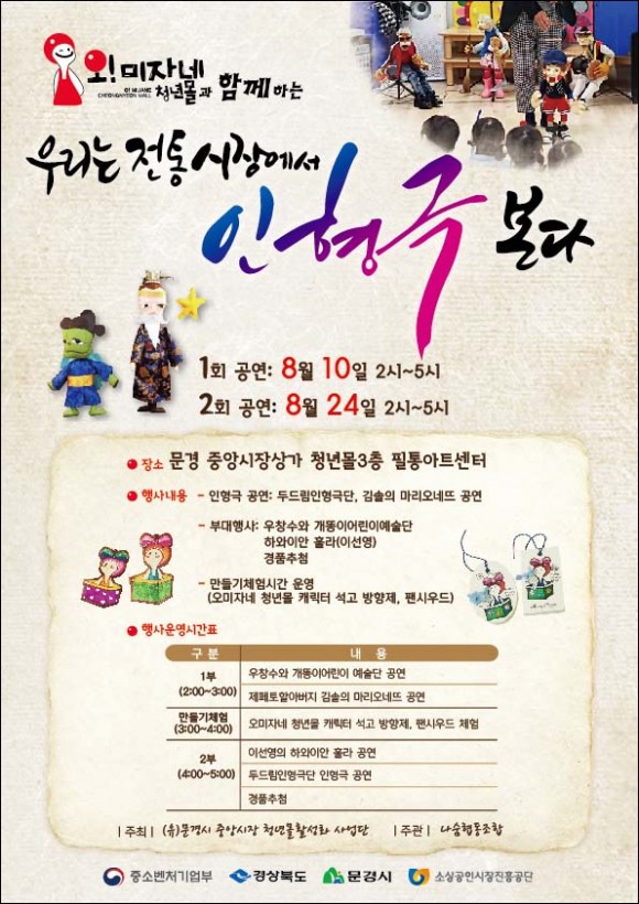 |  | | | ⓒ (주)영남도민일보 | | [영남도민일보] 김재근 기자 = 문경중앙시장 오!미자네 청년몰에서 오는 8월 10일(토), 24일(토) 2회에 걸쳐서 오후 2시부터 ‘우리는 전통시장에서 인형극 본다’ 이벤트를 진행한다.