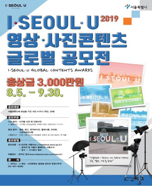 I·SEOUL·U 영상·사진콘텐츠 글로벌공모전」은 서울브랜드 의 정체성 키워드인 ‘공존, 열정, 여유’를 주제로 영상과 사진콘텐츠 2개 분야를 대상으로 개최되며, 접수기간은 8.5.(월)부터 9.30.(월) 약 2개월간이다.