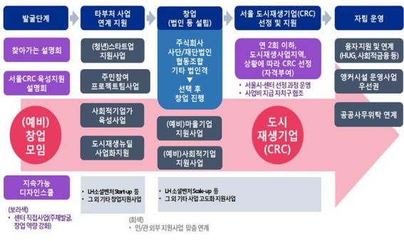 서울시는 자금지원과 더불어 계속 진행 중인 도시재생사업의 프로세스에 맞춰 초보 도시재생기업이 사회적기업 등 법인으로 발전할 수 있도록 시 도시재생지원센터를 통해 업종별·사업단계별 전문멘토그룹의 컨설팅 및 타 기관의 사업 등과 연계할 수 있는 방안도 지원한다.