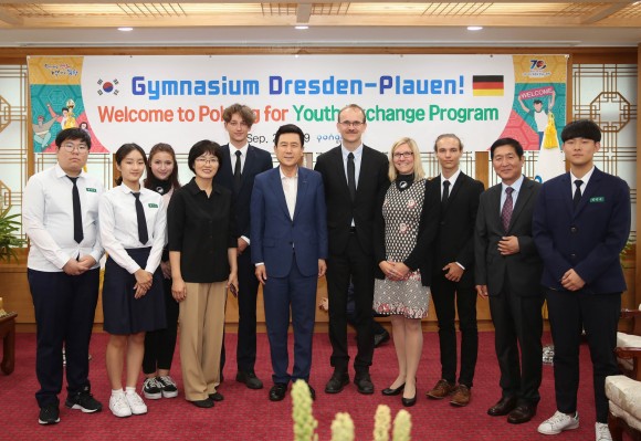 |  | | | ⓒ (주)영남도민일보 | | [영남도민일보] 홍인환 기자 = 포항시의 우호도시인 독일 드레스덴시의 드레스덴-플라우엔 김나지움 학생과 교사 18명이 8월 26일부터 10일간 포항제철고등학교와 학교교류를 위해 포항시를 찾았고, 지난 2일에는 시청을 방문하여 이강덕 포항시장과 상호교류에 대한 의견 교환의 자리를 가졌다.