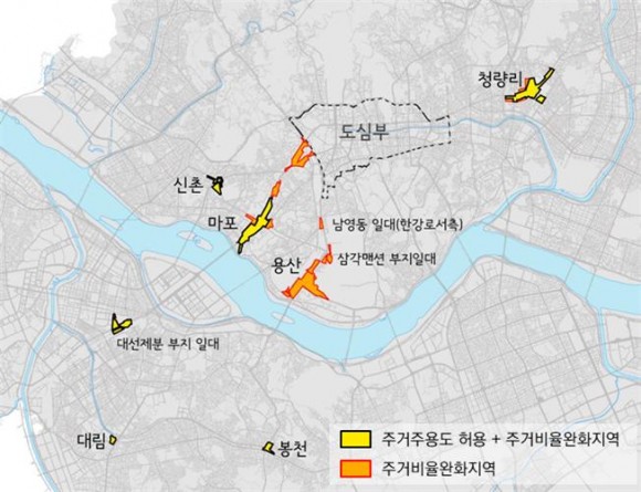 금회 기본계획 변경은 우리시의 ‘주택공급 5대 혁신방안’ 및 ‘8만호 추가공급 세부계획’의 일환이며 도시정비형재개발 시에 직주근접 실현이 가능하도록 3년간 한시적으로 주택공급을 확대하기 위한 것으로 한양도성외 7개소에 대한 주거주용도를 허용하고, 공공주택 도입을 위한 주거비율 확대 및 용적률 완화가 주 내용이다. 이 경우, 공공주택 도입 비율은 각 완화된 용적률의 1/2 수준이다. 다만, 공공주택 도입에 따른 연면적 증가와 연동하여 최고높이를 일부 완화하는 사안은, 좀더 신중하고 면밀한 검토·논의가 필요하다는 다양한 의견을 수렴하여 금회 변경에서 제외하는 것으로 수정가결 되었다.