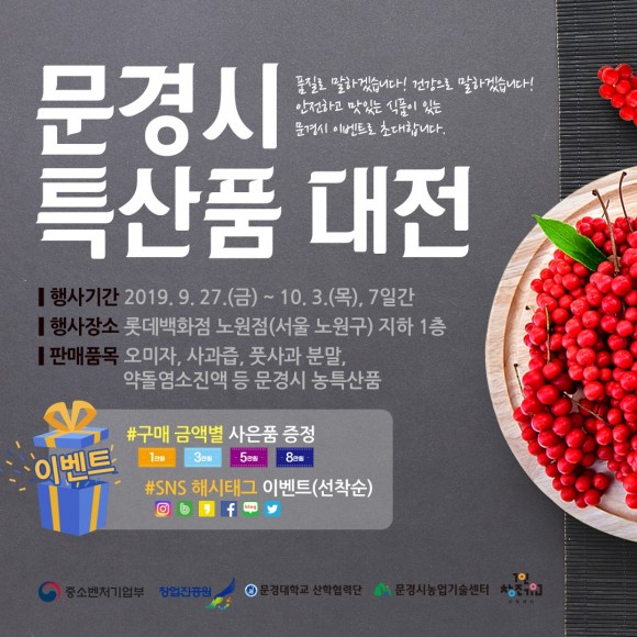 이번 행사는 문경시 1인 창조기업 지원센터와 문경대학교 창업보육센터가 공동운영하며 오미자 생과, 오미자청, 오미자차, 사과즙, 풋사과 분말, 유기농 아로니아 분말·생즙, 약돌염소 진액, 작두콩 차·청국장·두부과자 등 문경지역에서 생산된 농·특산품을 판매한다. 오미자 산업특구로 지정된 문경오미자를 합리적인 가격으로 만나볼 수 있으며. 오미자뿐만 아니라 사과즙, 약돌염소 진액 등 지역 특산물을 이용한 우수한 제품들을 만나볼 수 있는 절호의 기회이다.