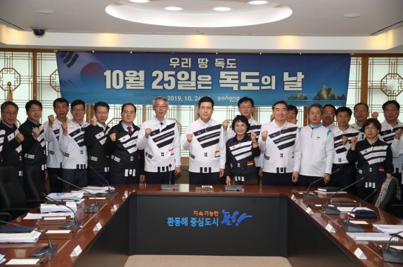 24일 시청 중회의실에서 열린 간부회의에는 참석자 모두 독도사랑 티셔츠를 입고 고종황제가 독도를 울릉도의 부속 섬으로 공표한 대한칙령 제41호 제정일인 1900년 10월 25일을 기념해 제정 된 독도의 날의 의미를 되새기고, 독도의 소중함과 더불어 우리 땅 독도에 대한 수호의지를 다짐했다.