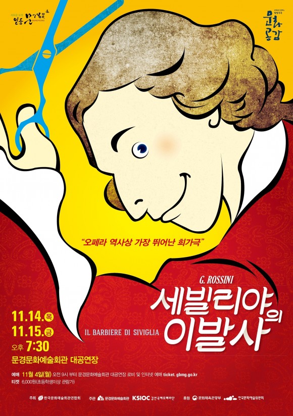 |  | | | ⓒ (주)영남도민일보 | | [영남도민일보] 김재근 기자 = 2019년 문예회관과 함께하는 방방곡곡 문화공감 사업의 일환으로 한국문화예술회관연합회가 주최하고 문경문화예술회관과 김선국제오페라단이 주관하는 오페라 ‘세빌리야의 이발사’가 오는 11월 14일(목), 11월 15일(금) 오후7시30분 이틀간 문경문화예술회관 대공연장 무대에 오른다.