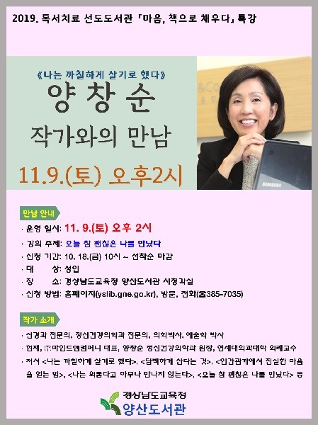 경상남도교육청 양산도서관 독서치료 선도도서관 사업의 일환으로 진행되는 이번 특강은 ‘나는 까칠하게 살기로 했다’의 작가 <양창순 박사>를 초청해 자존감 회복 및 편안한 인간관계에 도움이 되는 내용으로 11월 9일 오후 2시에 진행된다.