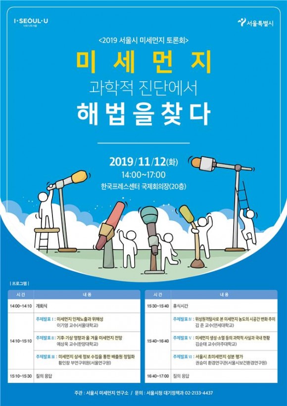 서울시는 오는 12일 오후 2시 서울 중구 한국프레스센터 20층 국제회의장에서 ‘미세먼지, 과학적 진단에서 해법을 찾다’를 주제로 미세먼지 토론회를 개최한다.