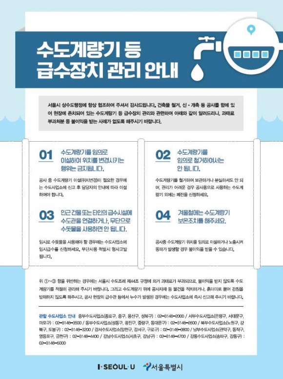 시는 앞으로도 위반행위가 발생하지 않도록 공사현장 등 취약지역에 대한 홍보를 지속적으로 실시할 예정이다. 백호 서울시 상수도사업본부장은 “수돗물은 서울시가 생산‧공급하는 공공재로서 정당한 대가를 지불하지 않고 부정적으로 사용하는 행위는 위법사항”이라며 “수도계량기 무단철거 등 미처 규정을 인지하지 못해 발생할 가능성이 높은 위반 행위에 대해서는 계도와 안내를 통해 예방하는 한편, 지속적인 단속 및 점검도 병행하여 급수설비를 철저히 관리할 수 있도록 적극적으로 홍보해나가겠다”고 말했다.