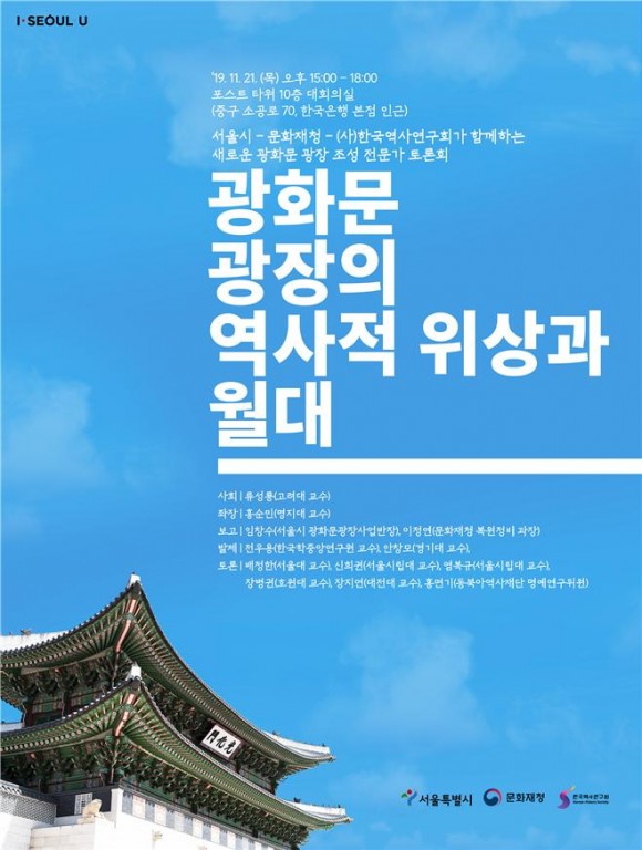 토론자는 역사, 고고학, 관광, 건축, 조경 등 다양한 분야의 전문가가 참여하며, 언론기고 등을 통해 부정적 견해를 제시한 전문가와 학회추천인사 등으로 구성해 광화문광장 조성과 관련하여 역사관점에서의 의의 및 방향 등에 논의할 계획이다. 전우용 한국학중앙연구원 교수(대한민국과 경복궁 앞), 안창모 경기대 교수(경복궁-세종대로의 근현대기 도시구조와 건축변화)가 발제한다. 토론자로는 ▴배정한 서울대 교수 ▴신희권 서울시립대 교수 ▴ 염복규 서울시립대 교수 ▴장병권 호원대 교수 ▴장지연 대전대 교수 ▴홍면기 동북아역사재단 명예연구위원이 참여한다.