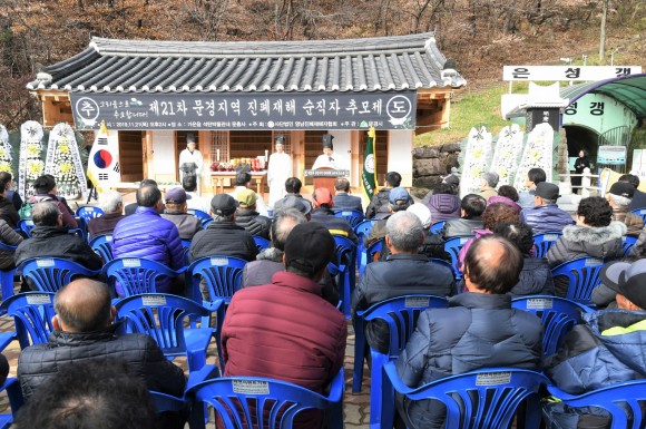 |  | | | ↑↑ 제21주기 진폐순직자 위령제 | | ⓒ (주)영남도민일보 | | [영남도민일보] 김재근 기자 = (사)영남진폐재해자협회 문경시지부(협회장 정성국)에서 주관한 제21주기 진폐재해순직자 추모제가 11월 21일 오후 2시에 진폐순직자 위패실(문흥사)에서 고윤환 문경시장, 김창기 시의회 부의장, 정성국 협회장을 비롯한 문경시 진폐재해자 및 유족 등 약 300여명이 참석한 가운데 개최됐다.